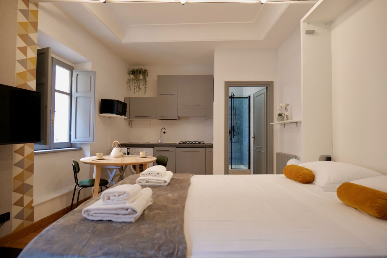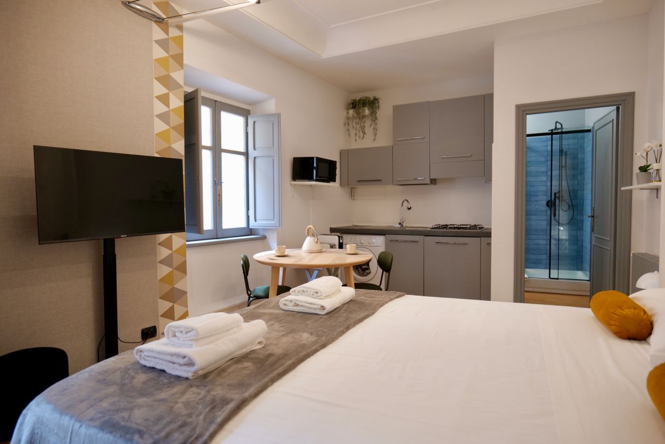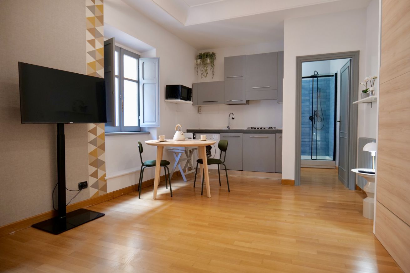 Questo piccolo ma accogliente monolocale si trova nel cuore di Trastevere, a pochi passi dalla Basilica di Santa Cecilia. L'appartamento offre un ambiente intimo con un comodo letto matrimoniale e un pratico angolo cottura, perfetto per preparare pasti veloci. Il bagno, pur essenziale, si distingue per il suo stile deciso e moderno, donando carattere all'intero spazio. Ideale per chi desidera vivere un'esperienza autentica e rilassante nella suggestiva atmosfera di Trastevere.
